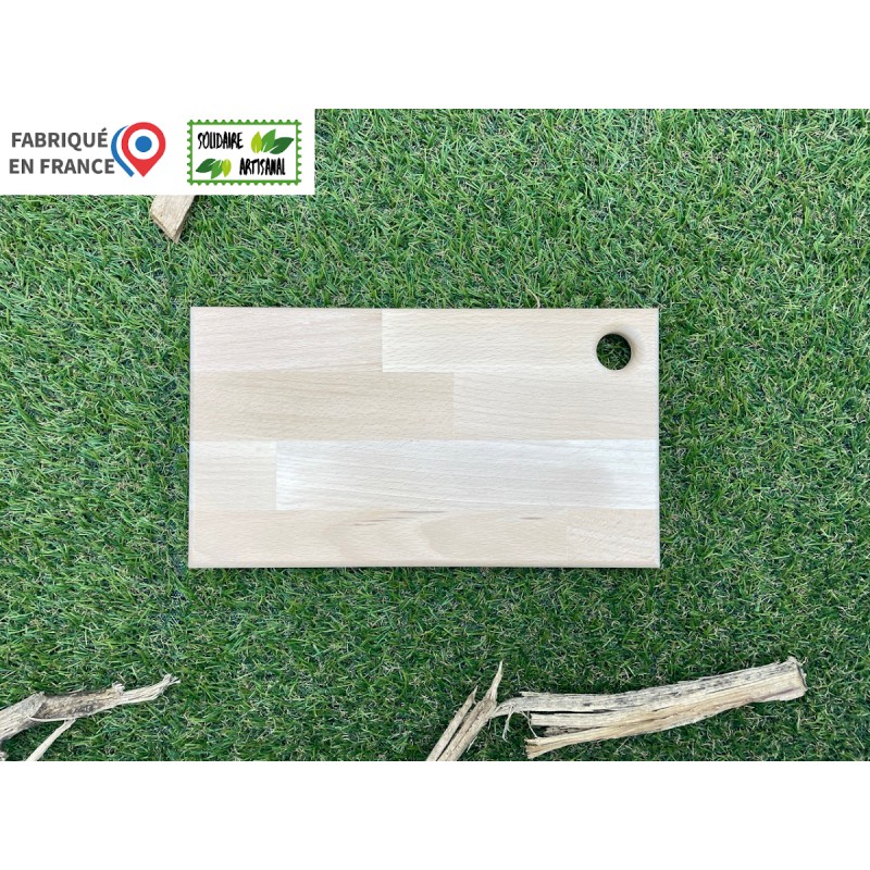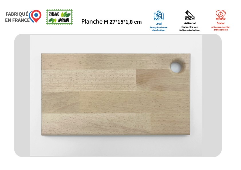 Planche à découper Made in France 🇫🇷 – Taille M 🇫🇷 Fabriquée en France, Solidaire, éco-responsable et personnalisable : l'alliance parfaite entre utilité et engagement ! 🌿 Éco-responsable : Le bois provient de forêts gérées durablement et est certifié PEFC (au moins 70 % de matériaux recyclés), respectant ainsi votre engagement pour la planète. 🔧 Personnalisable : Que ce soit pour graver un texte, un logo, ou même un dessin à partir d’une photo, notre service de gravure laser vous offre une liberté totale de personnalisation ! La gravure de 220*120 mm est incluse dans le prix. 🪵 Finitions : Un trou de 22 mm à 25 mm des bords est intégré pour un rangement facile, et un quart de rond de 5 mm adoucit les bords pour un confort d’utilisation optimal. Ponçage grain 180 (très doux au toucher) 🌍 Production locale et solidaire : Chaque planche est produite à Grenoble par une entreprise d’insertion, garantissant un savoir-faire artisanal et un engagement social fort. 📐Détails techniques : - Référence produit : PMFRANCE - Dimensions : 270x150x18 mm - Poids : 490 g - Personnalisation : Gravure laser incluse dans le prix (220x120 mm) - Fabriqué en France : Petite gravure "Fabriqué en France" au dos de chaque produit. Possibilité d'ajouter une étiquette "Fabriqué en France". - Quantité minimum de commande : 10 pièces ⏳ Délais de production : - 10 à 49 pièces : 2 jours - 50 à 99 pièces : 5 jours - 100 à 249 pièces : 10 jours - 250 à 499 pièces : 20 jours - 500 à 2000 pièces : 45 jours - Plus de 2000 pièces : nous consulter