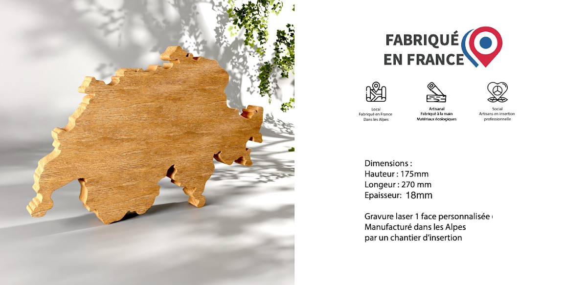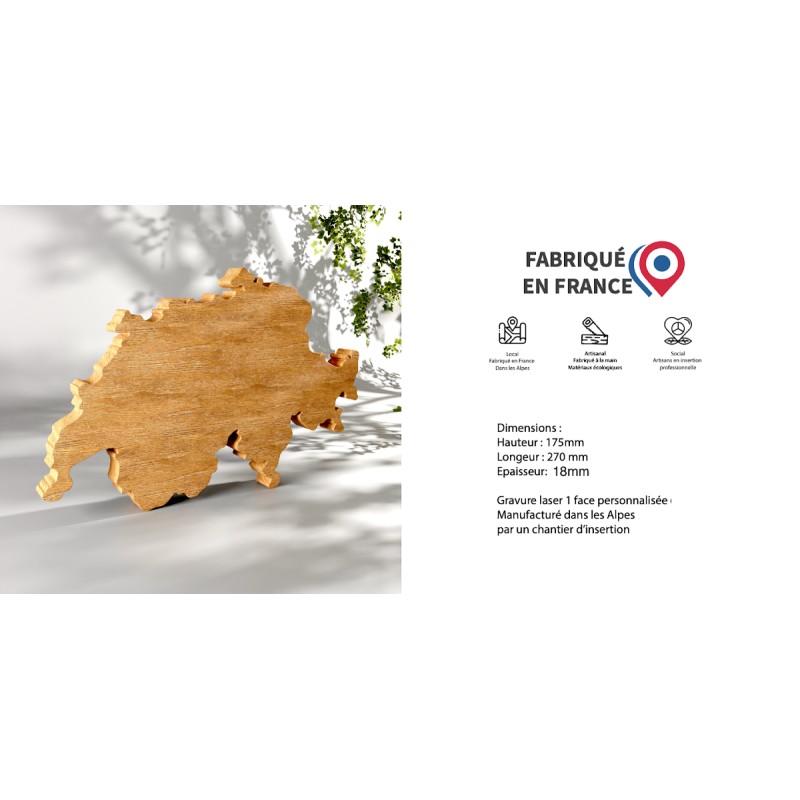 Planche à découper forme Suisse  🍽️🌳 Fabriquée en France 🇫🇷  ✨ Détails techniques : Matériau : Hêtre massif Dimensions : Longueur 270 mm x Largeur 174 mm x Épaisseur 18mm .  Gravure : Personnalisation par gravure laser sur une face (inclus). VERSO EN OPTION Production : 100 % française 🇫🇷, artisanale et solidaire